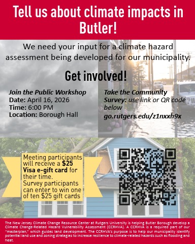 The Borough of Butler has been selected by Rutgers University as a community to receive a Climate Change-Related Hazard Vulnerability Assessment (CCRHVA). Butler’s plan will serve as a template for other municipalities across the State of New Jersey, making this an important opportunity for our community to help shape both local and broader planning discussions.